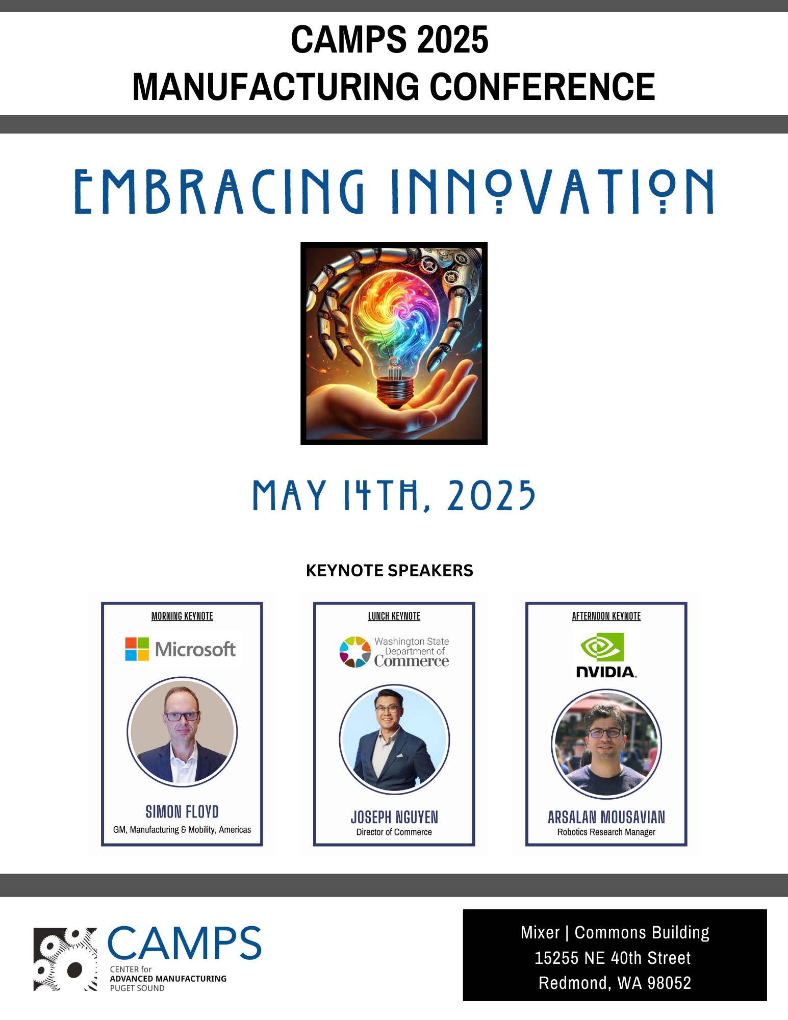The Center for Advanced Manufacturing Puget Sound (CAMPS) has an ongoing series of events. These events offer new insights about markets, opportunities, and solutions that are impacting the whole membership or are of significant interest to members.